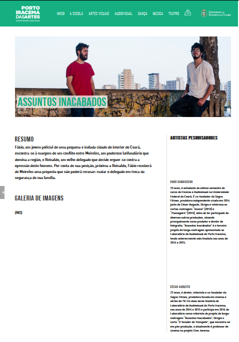 César Augusto nasceu em Fortaleza, no Ceará em 1989. Formado em Cinema e Audiovisual pela Universidade Federal do Ceará, César se divide entre a escrita de roteiros e a escrita literária.Em 2016 participou do Laboratório de Criação do Porto Iracema das artes com o projeto “Assuntos Inacabados”, onde teve tutoria dos diretores Karim Aïnouz, Sérgio Machado e Marcelo Gomes. No mesmo ano, foi professor de audiovisual para adolescentes no Projeto Cine Jurema.