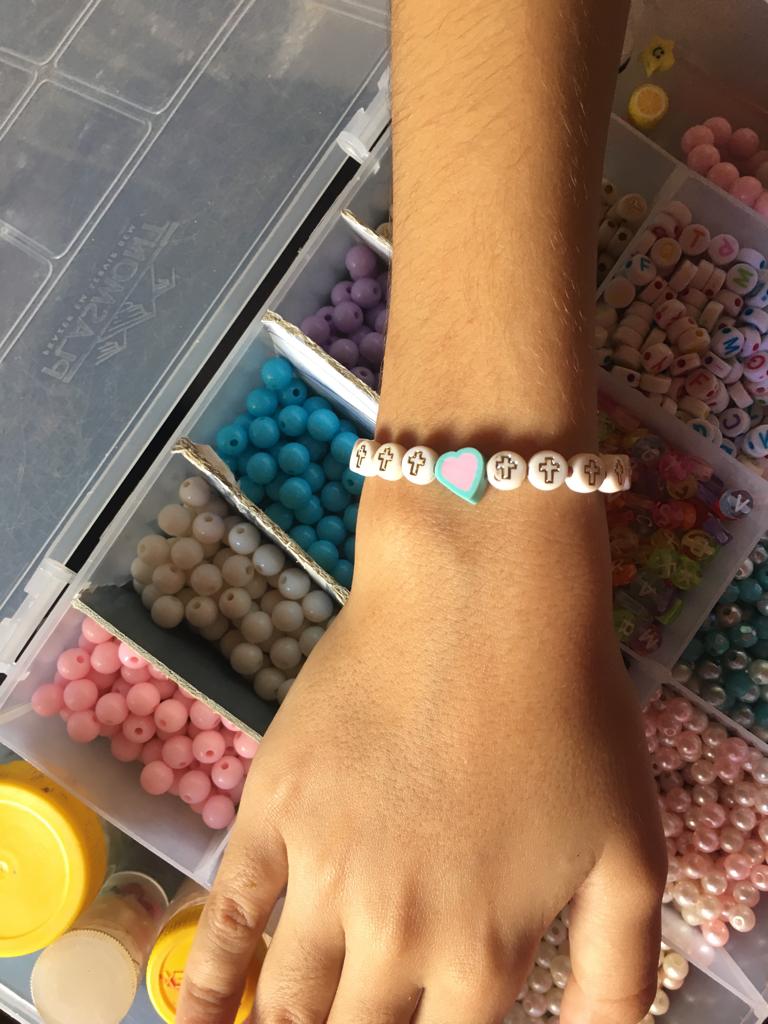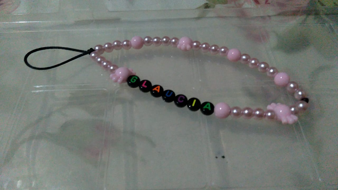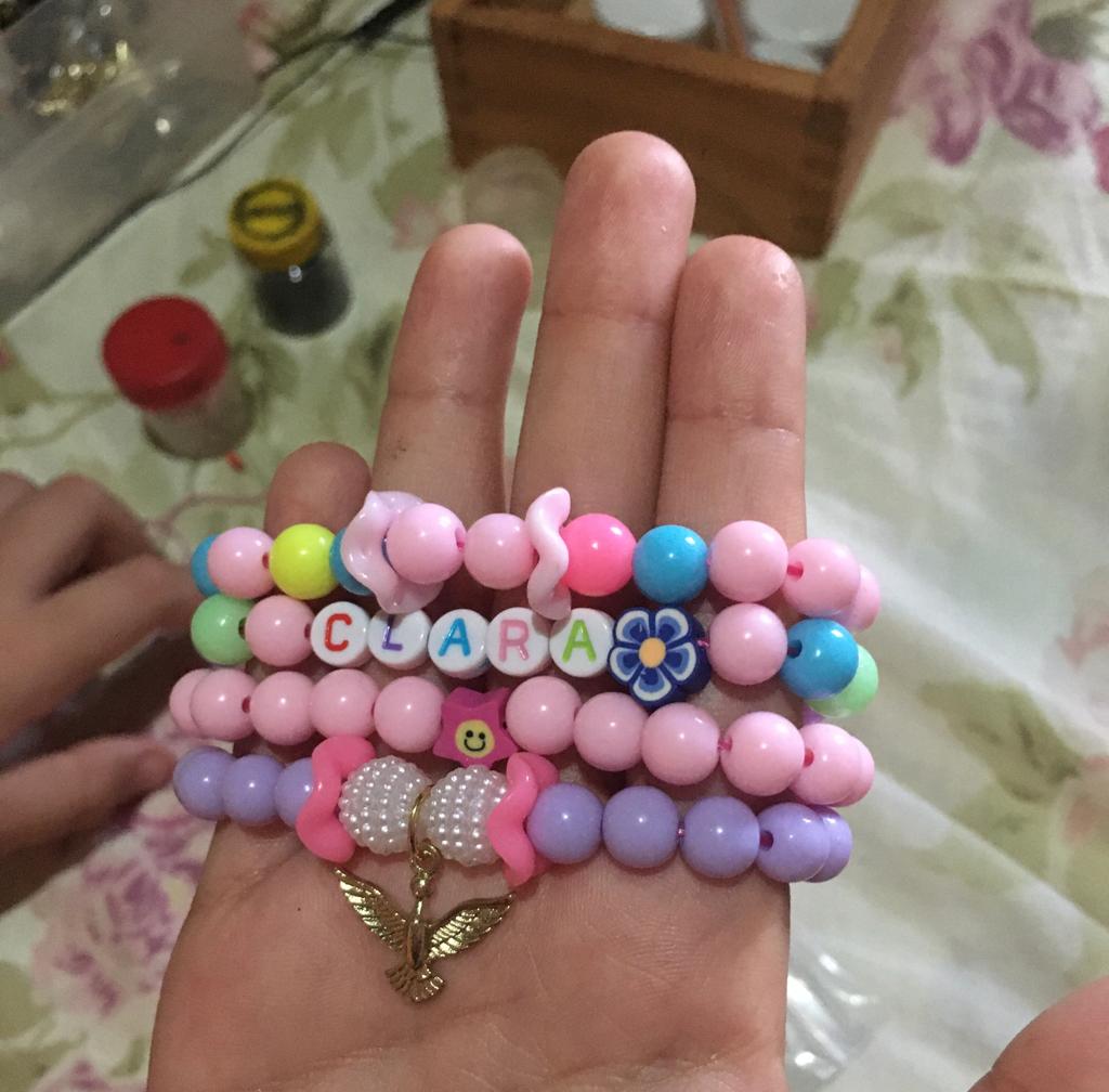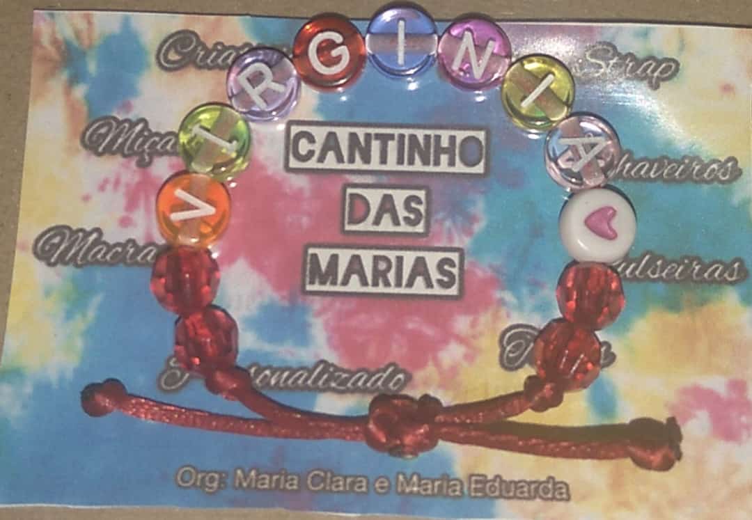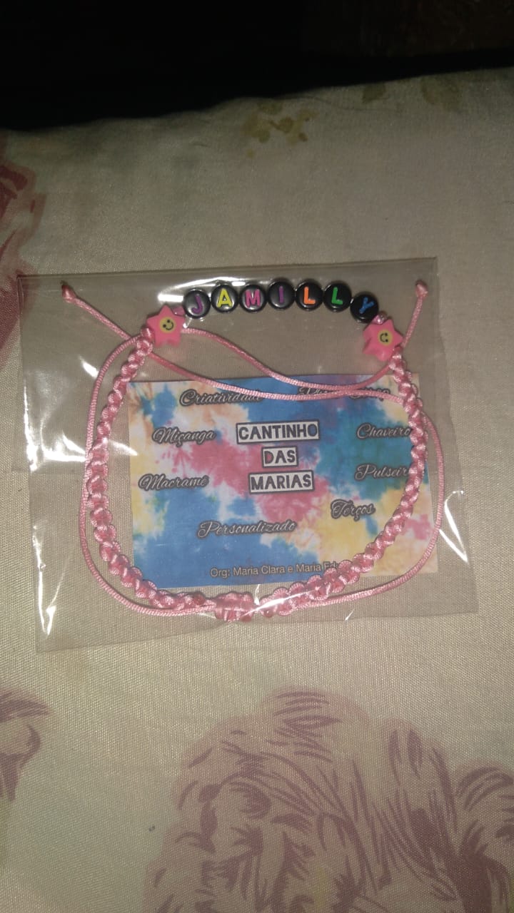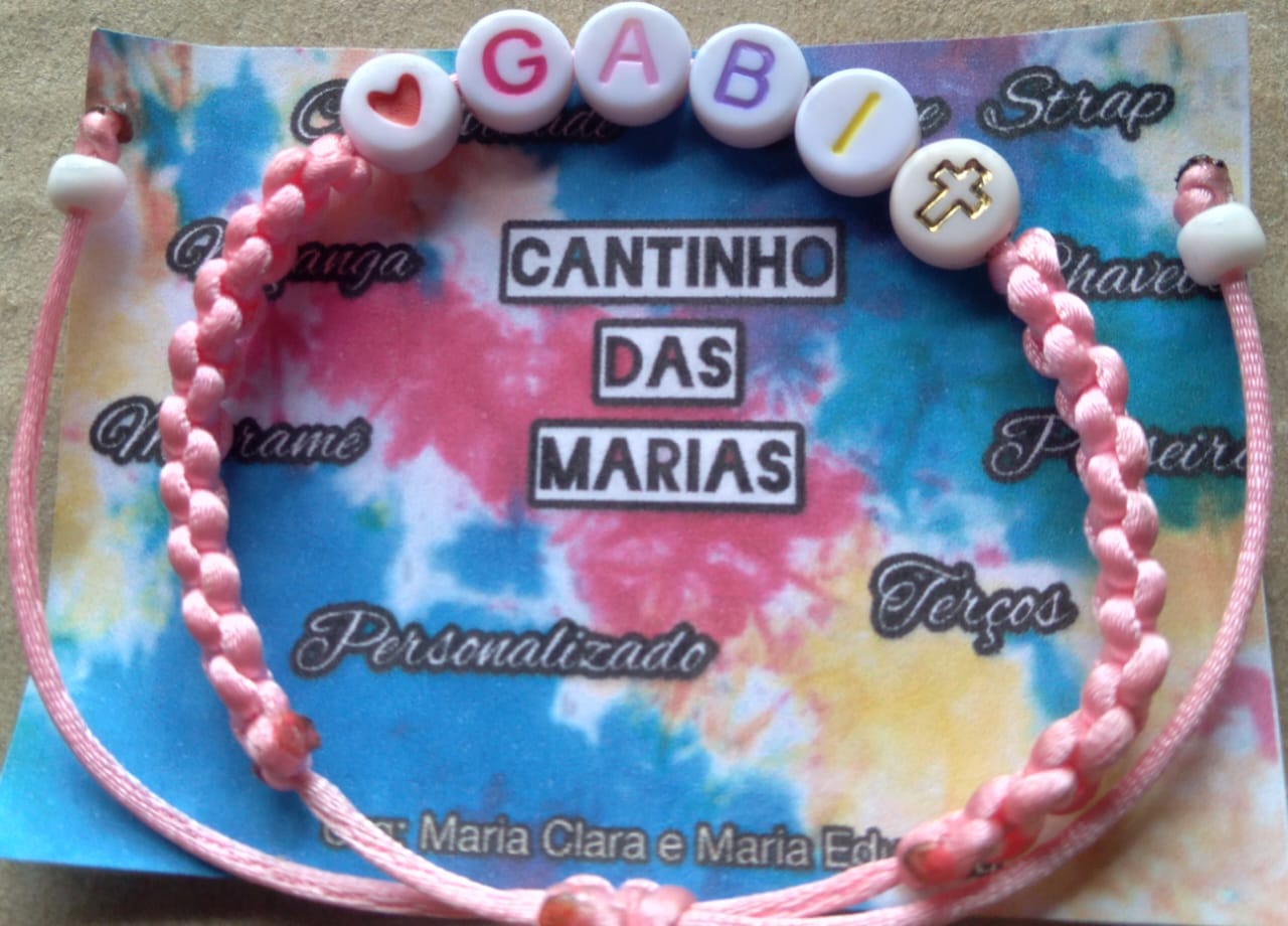 Fazemos diversos modelos de pulseiras, strap cordinha, chaveiros, phone strap, e terços utilizando miçangas e macramê. Fazemos os produtos personalizados com o nome do cliente também. Nosso trabalho é recente desde janeiro de 2023. Nós iniciamos após ganharmos um kit de presente de aniversario e começamos a criar modelos e vender para nossas colegas da escola e logo algumas pessoas da comunidade passaram a se interessar pelos produtos. Então investimos o que ganhamos para comprar mais miçangas, linhas e fios para produzir. Sempre estamos pesquisando modelos na internet e aprendendo mais. Somos muito criativas e sempre tivemos interesse em empreender.Galeria