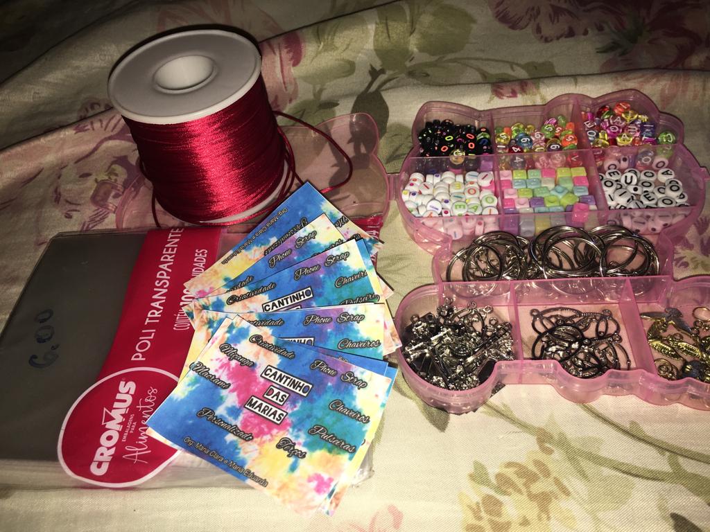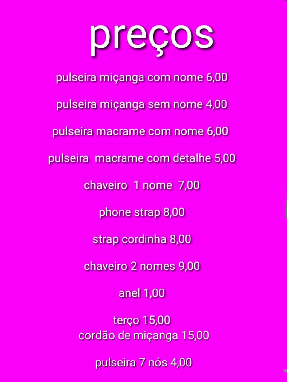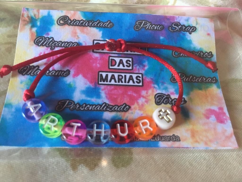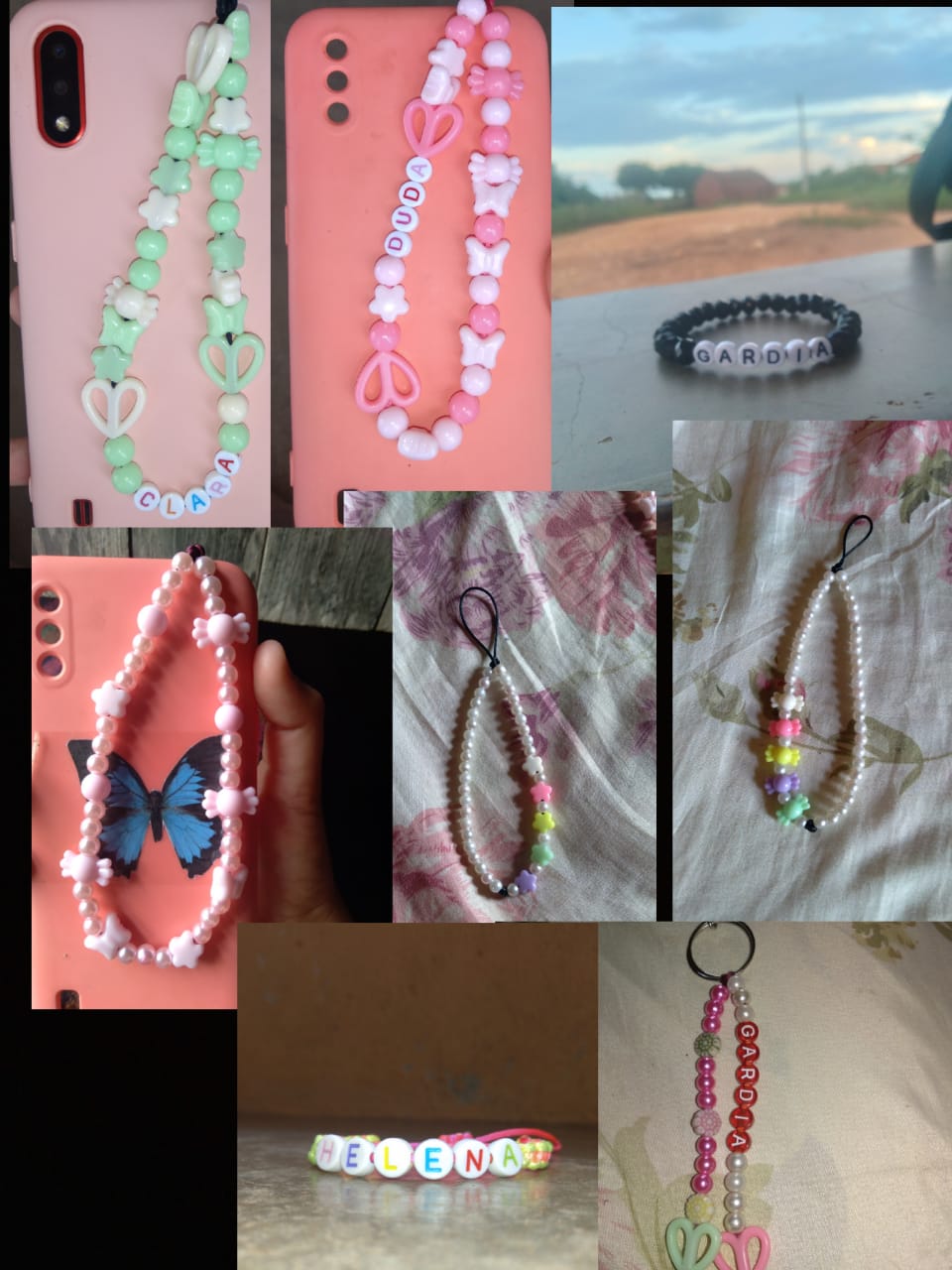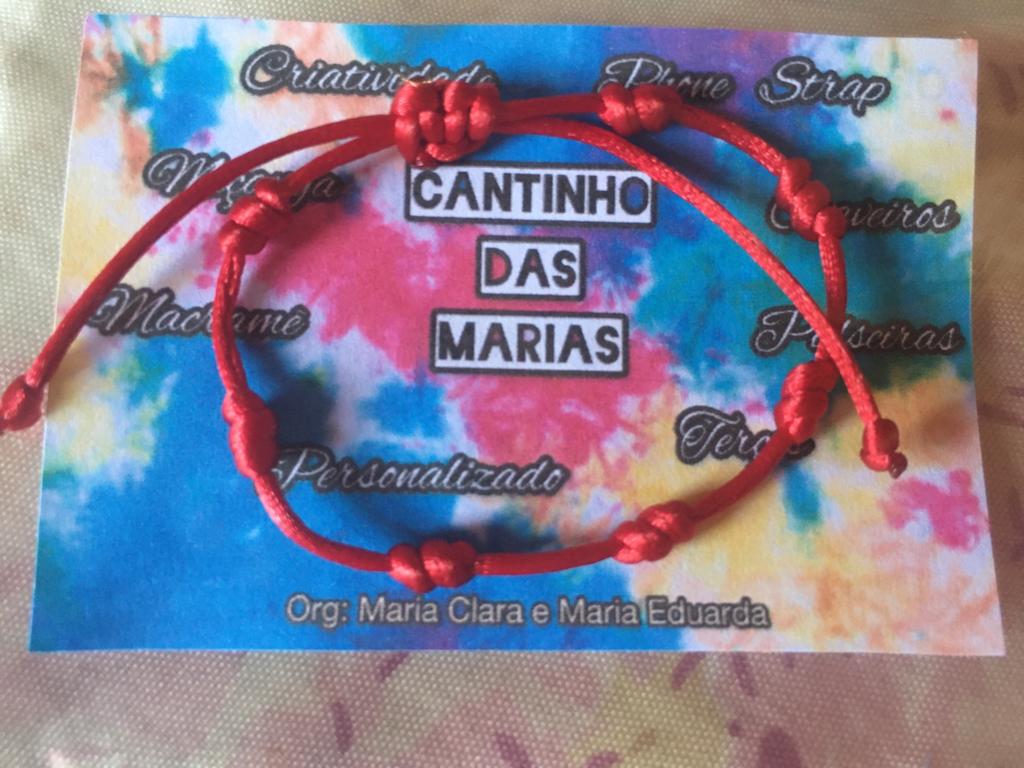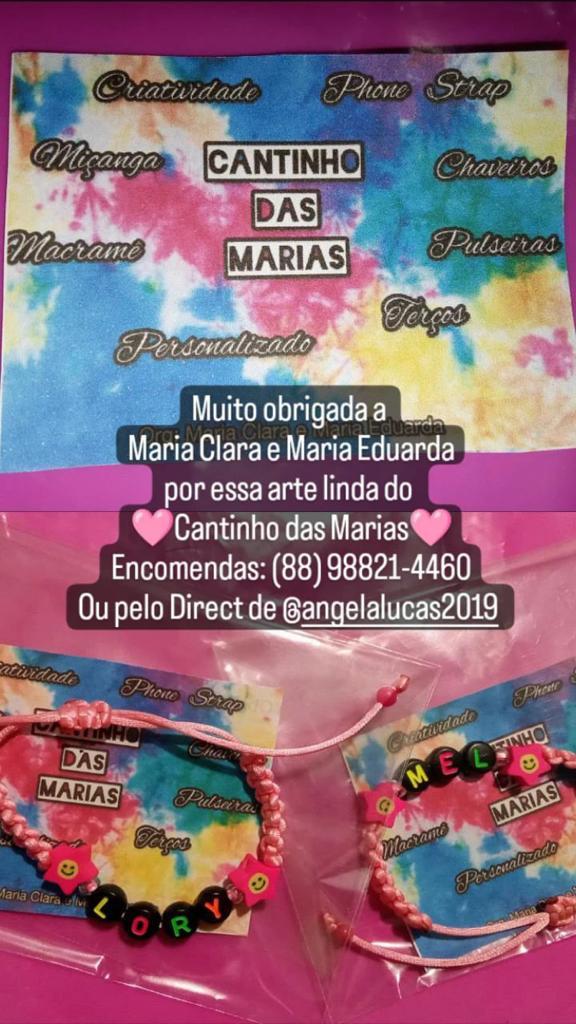 Fazemos diversos modelos de pulseiras, strap cordinha, chaveiros, phone strap, e terços utilizando miçangas e macramê. Fazemos os produtos personalizados com o nome do cliente também. Nosso trabalho é recente desde janeiro de 2023. Nós iniciamos após ganharmos um kit de presente de aniversario e começamos a criar modelos e vender para nossas colegas da escola e logo algumas pessoas da comunidade passaram a se interessar pelos produtos. Então investimos o que ganhamos para comprar mais miçangas, linhas e fios para produzir. Sempre estamos pesquisando modelos na internet e aprendendo mais. Somos muito criativas e sempre tivemos interesse em empreender.Galeria