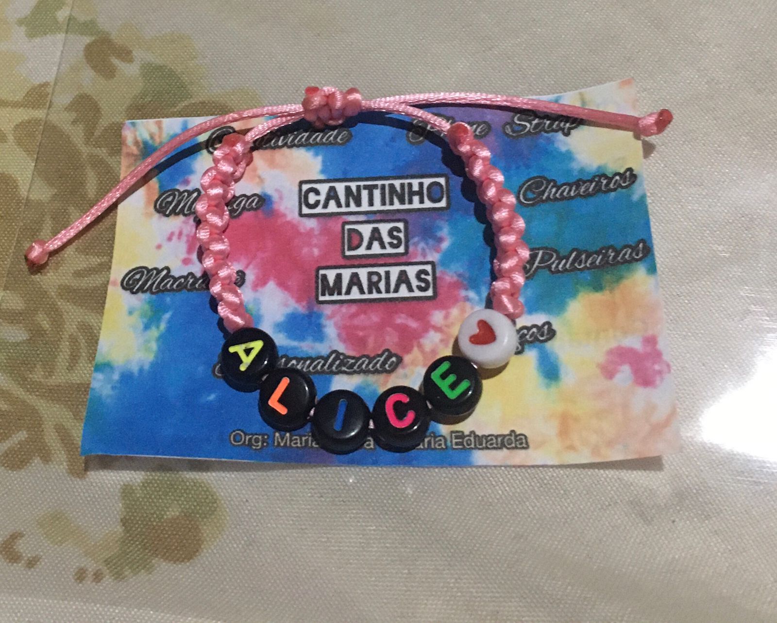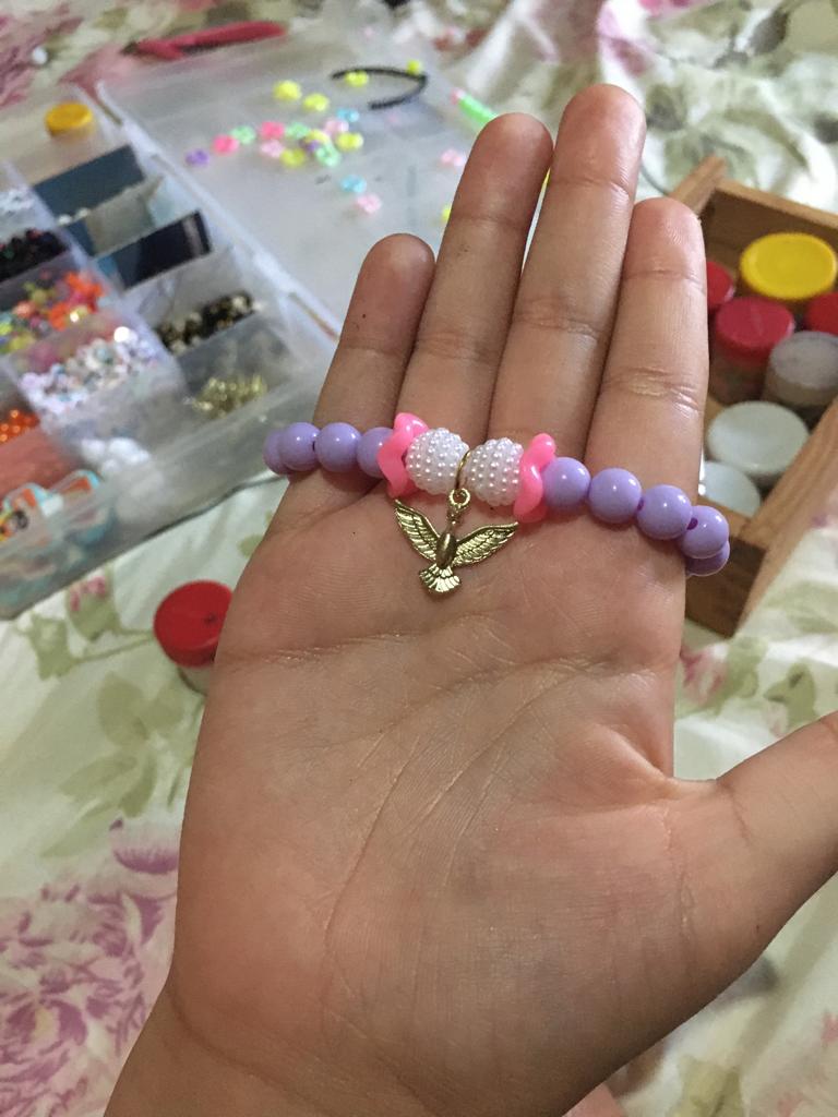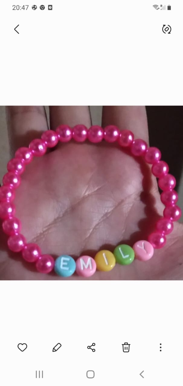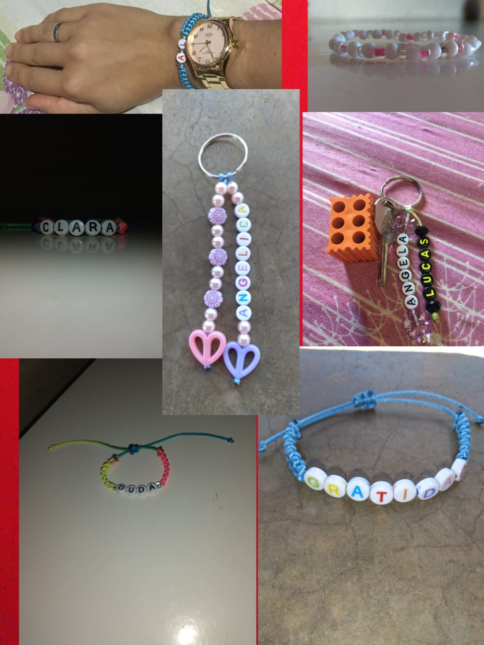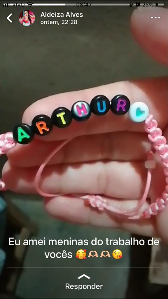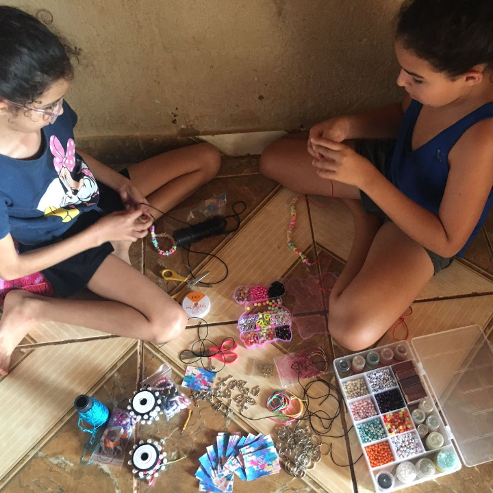 Fazemos diversos modelos de pulseiras, strap cordinha, chaveiros, phone strap, e terços utilizando miçangas e macramê. Fazemos os produtos personalizados com o nome do cliente também. Nosso trabalho é recente desde janeiro de 2023. Nós iniciamos após ganharmos um kit de presente de aniversario e começamos a criar modelos e vender para nossas colegas da escola e logo algumas pessoas da comunidade passaram a se interessar pelos produtos. Então investimos o que ganhamos para comprar mais miçangas, linhas e fios para produzir. Sempre estamos pesquisando modelos na internet e aprendendo mais. Somos muito criativas e sempre tivemos interesse em empreender.Galeria