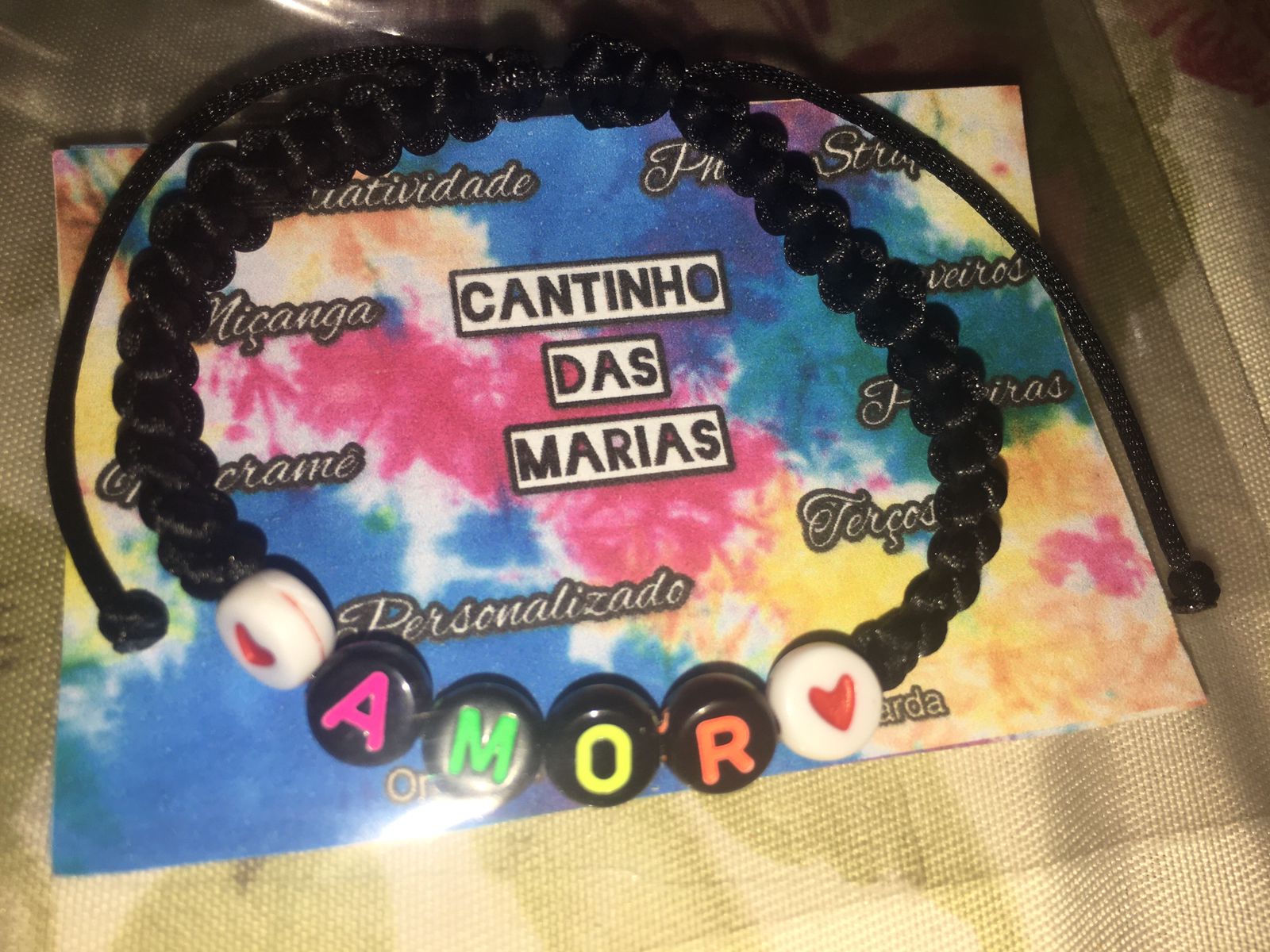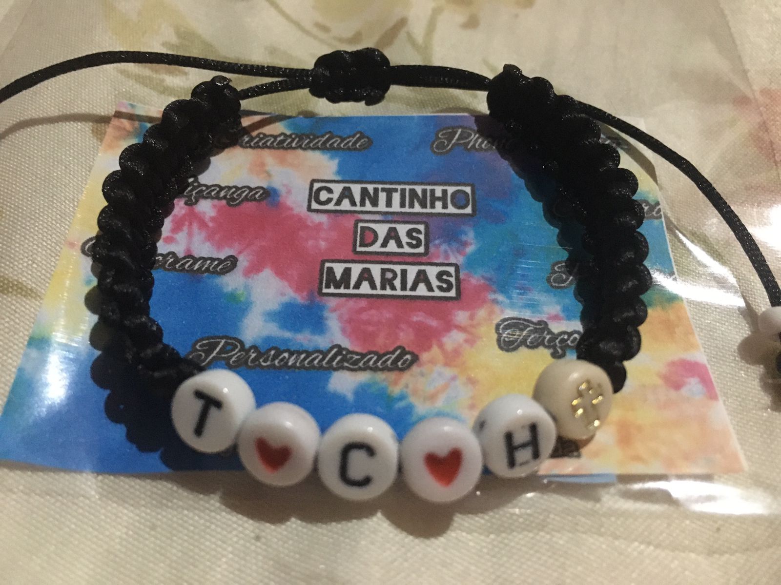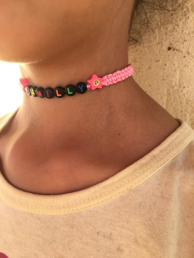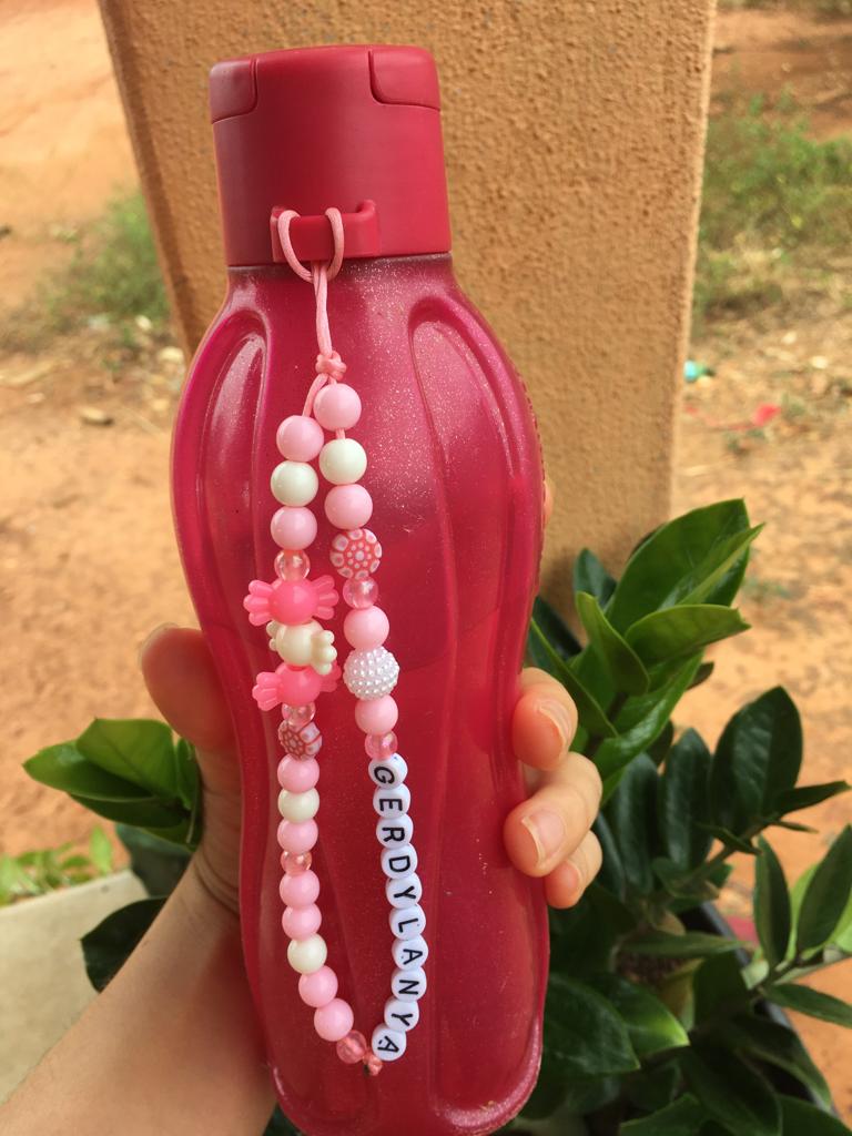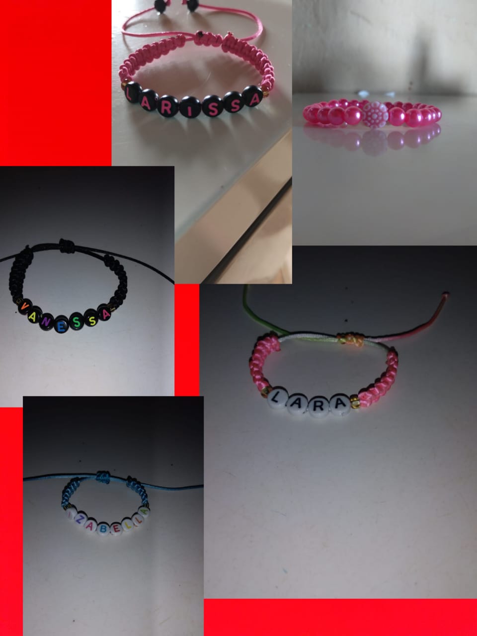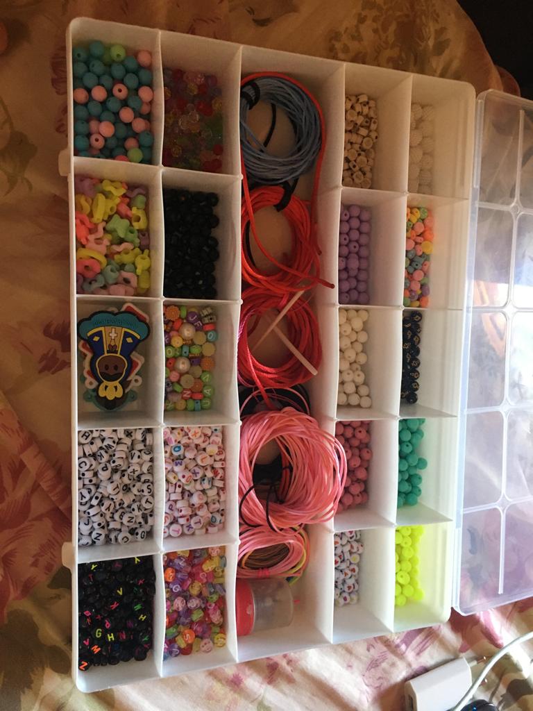 Fazemos diversos modelos de pulseiras, strap cordinha, chaveiros, phone strap, e terços utilizando miçangas e macramê. Fazemos os produtos personalizados com o nome do cliente também. Nosso trabalho é recente desde janeiro de 2023. Nós iniciamos após ganharmos um kit de presente de aniversario e começamos a criar modelos e vender para nossas colegas da escola e logo algumas pessoas da comunidade passaram a se interessar pelos produtos. Então investimos o que ganhamos para comprar mais miçangas, linhas e fios para produzir. Sempre estamos pesquisando modelos na internet e aprendendo mais. Somos muito criativas e sempre tivemos interesse em empreender.Galeria