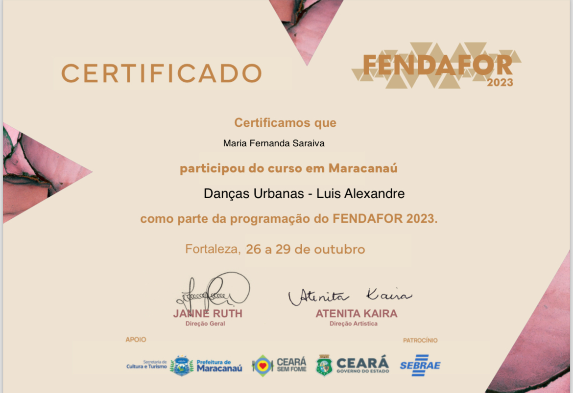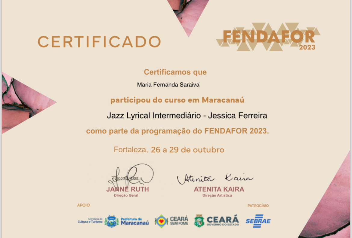 Sou formada no Curso Técnico em Dança pelo Porto Iracema das Artes, no qual são inseridos os módulos de Dança Clássica, Anatomia da Dança, Dramaturgia da Dança, Dança e Ancestralidade, Estética, Dança e Filosofia, entre muitos outros dentro dessa área.