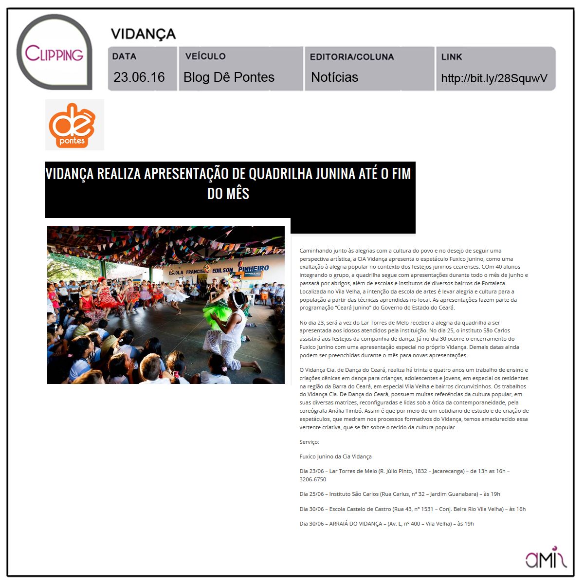 Com um trabalho aprimorado na força da cultura popular, o grupo de integrantes da Quadrilha Fuxico é composto por crianças, adolescentes e jovens atendidos na Escola de Artes e Ofícios Vidança que desenvolve há 37 anos um trabalho voluntário ministrando aulas de ballet clássico, danças dramáticas, laboratório de criação coreográfica, dança criativa, alongamento, consciência corporal, criações viso-manuais, criações literárias, capoeira, hip-hop, percussão, carpintaria e corte e costura. A formação do Grupo “Fuxico Junino” consiste em difundir as referências da cultura tradicional, trabalhada pela Escola Vidança na composição dos seus espetáculos, como é o caso do Espetáculo Catu Macã Guerra Bonita, que traz referências do Maracatu. Outros trabalhos, tais como “Histórias de Acordar o Amanhã” e “Esquadras”, também trazem danças populares em suas criações coreográficas como baião, coco, xaxado, bumba meu boi.Em 2015 a Quadrilha Fuxico Junino foi contemplada no XVII Edital Ceará Junino recebendo o apoio do Governo do Estado do Ceará e da Secretária de Cultura/SECULT o que possibilitou ao grupo realizar 17 apresentações em diversas entidades que desenvolvem atendimento ao publico infanto-juvenil, idosos, incluindo, as ruas e praças da comunidade dos bairros Vila Velha, Ellery e Carlito Pamplona no período de 05 de junho a 30 de julho/2015.