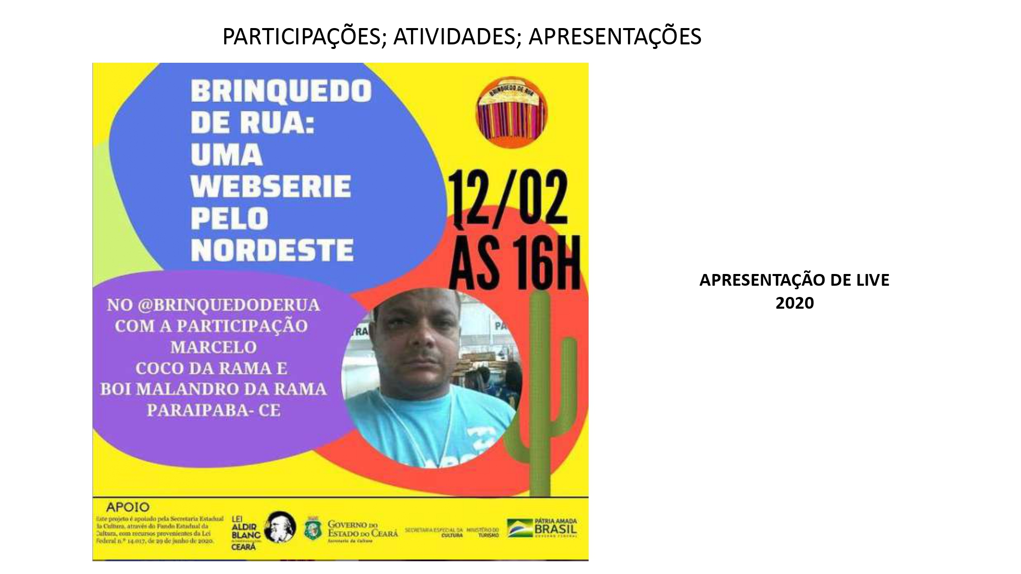 Caboco Maribé é artista, batuqueiro, cantor, compositor, arte-educador e pesquisador das tradições populares do Nordeste. Recebeu o nome artístico de um Mestre Juremeiro de Pau d’ Alho–PE e se reconhece como filho do tambor, aprendiz da rua e da roda — corpo em movimento guiado pela força dos ancestrais que fizeram da música um caminho de cura, resistência e comunhão. Técnico em Instrumento Musical (Acordeon) pelo IFCE e graduando em Filosofia pela UFC, une o saber acadêmico à oralidade e à prática comunitária, construindo pontes entre arte, espiritualidade e pensamento decolonial. Sua trajetória nasce da escuta, das festas de maracatu e dos cocos que atravessam o tempo como rios de memória.Desde 2016, integra o Coletivo Raízes do Griô e o Brinquedo de Rua, participando de processos formativos e ações voltadas ao fortalecimento da cultura popular como instrumento de transformação e pertencimento. Atua também na banda Banzo Beat — que mistura afrobeat, samba, candomblé e jazz em uma linguagem musical contemporânea e política — e no Coco da Dona Geralda, grupo que honra a memória da mestra curandeira de Tururu (CE) e afirma o coco como linguagem de resistência, espiritualidade e ancestralidade viva.