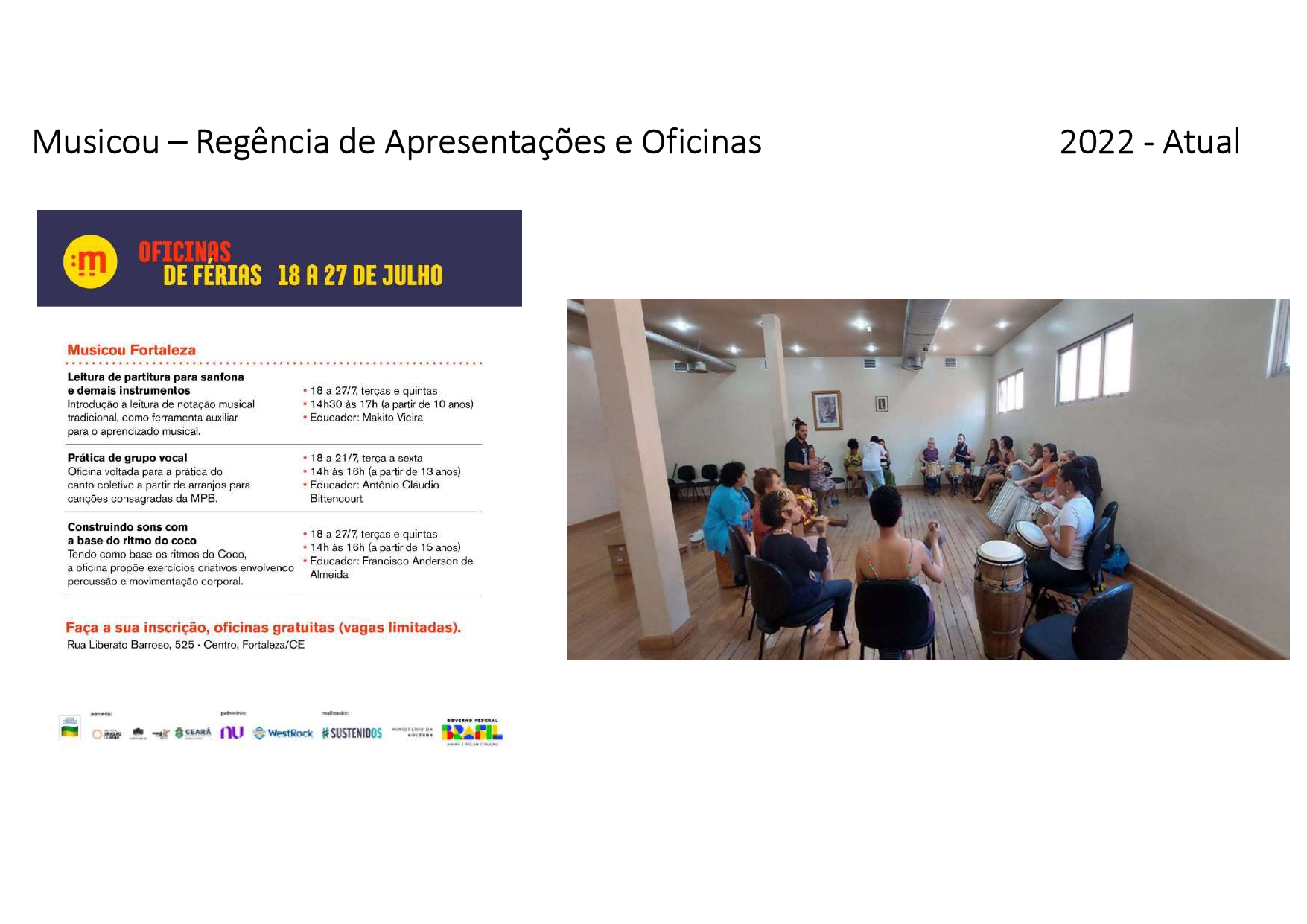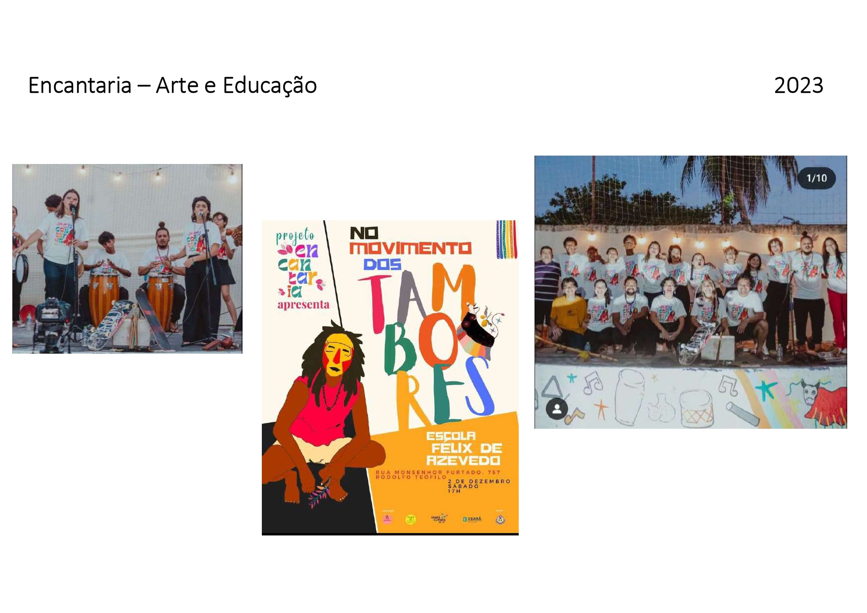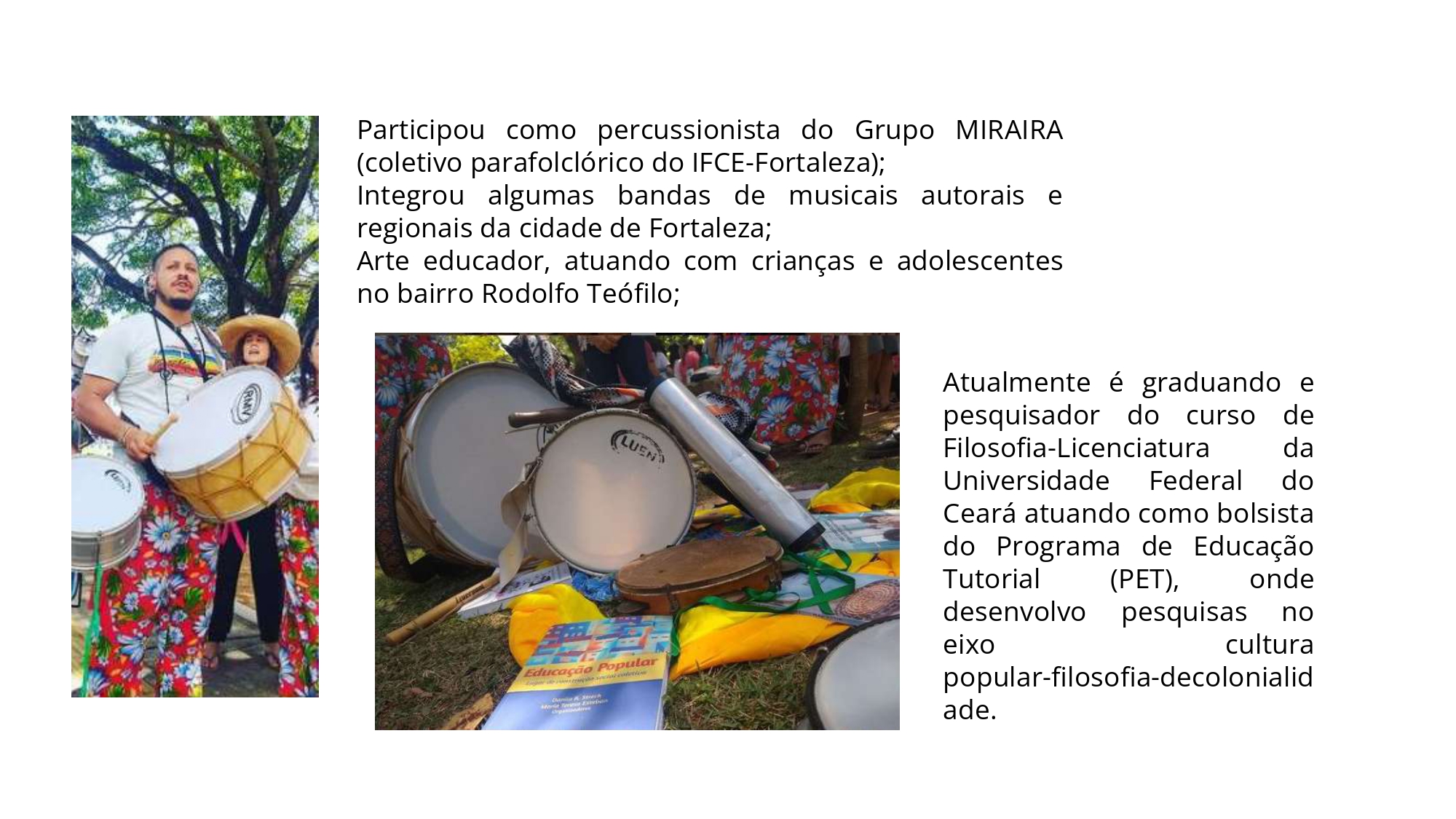 Como educador, desenvolve oficinas de percussão e cultura popular em comunidades e escolas públicas, acreditando na arte como ferramenta de formação, identidade e libertação. Sua pesquisa propõe um diálogo entre filosofia, oralidade e saberes de terreiro, compreendendo que o pensamento também pulsa no ritmo do tambor e nas memórias coletivas transmitidas pelos mais velhos.