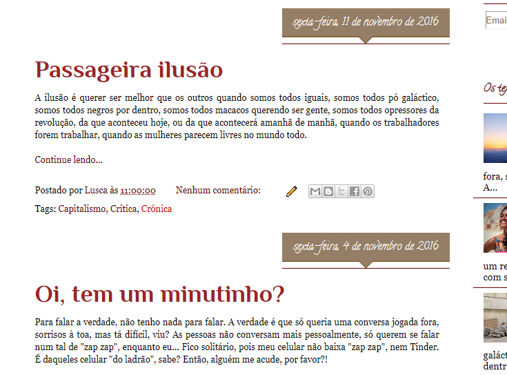 Lusca escreve crônicas, contos, resenhas, críticas e também sobre experiências desde de meados de 2016 para o blog O Universo de Lusca. Atualmente também trabalha no podcast homônimo.Vídeos