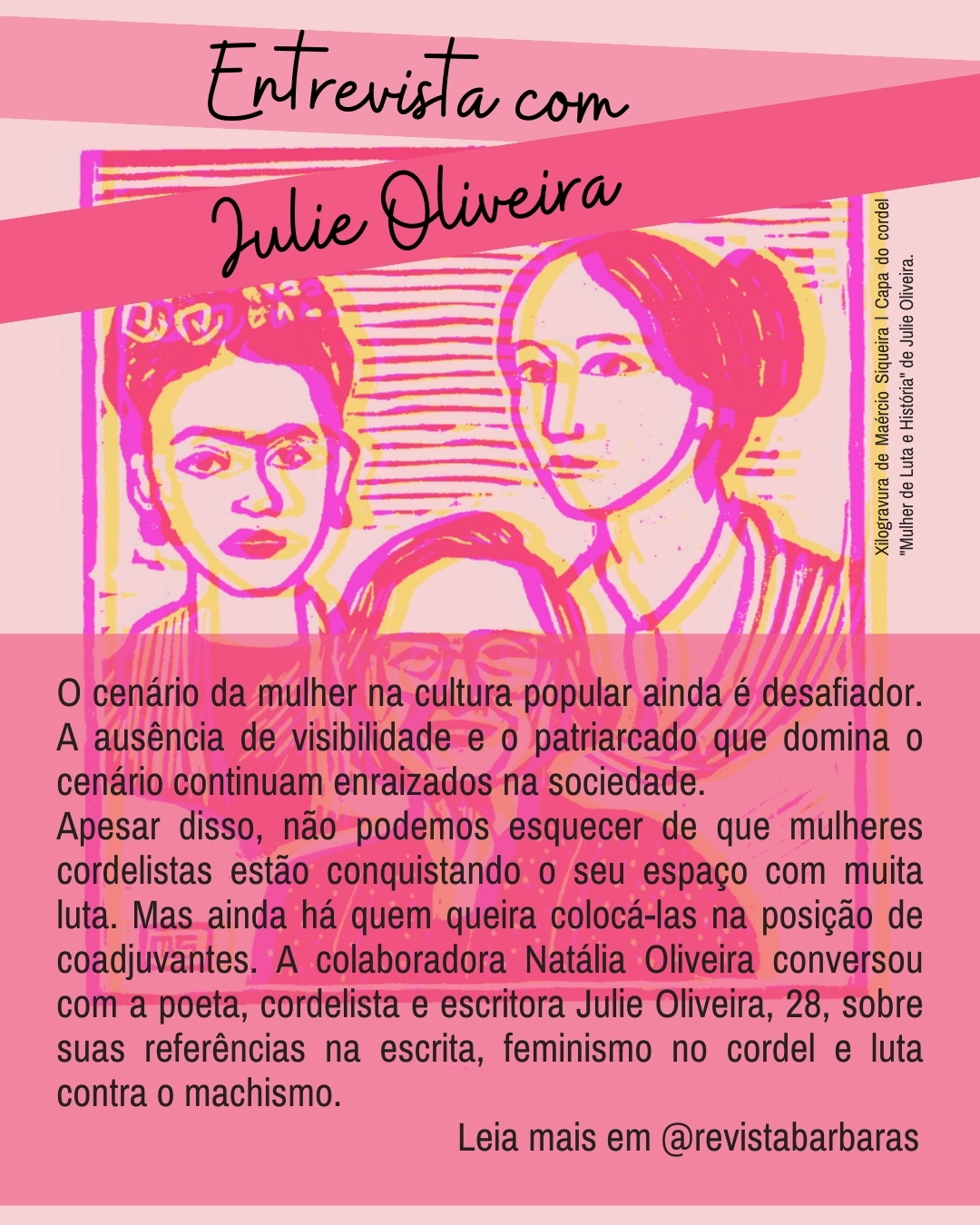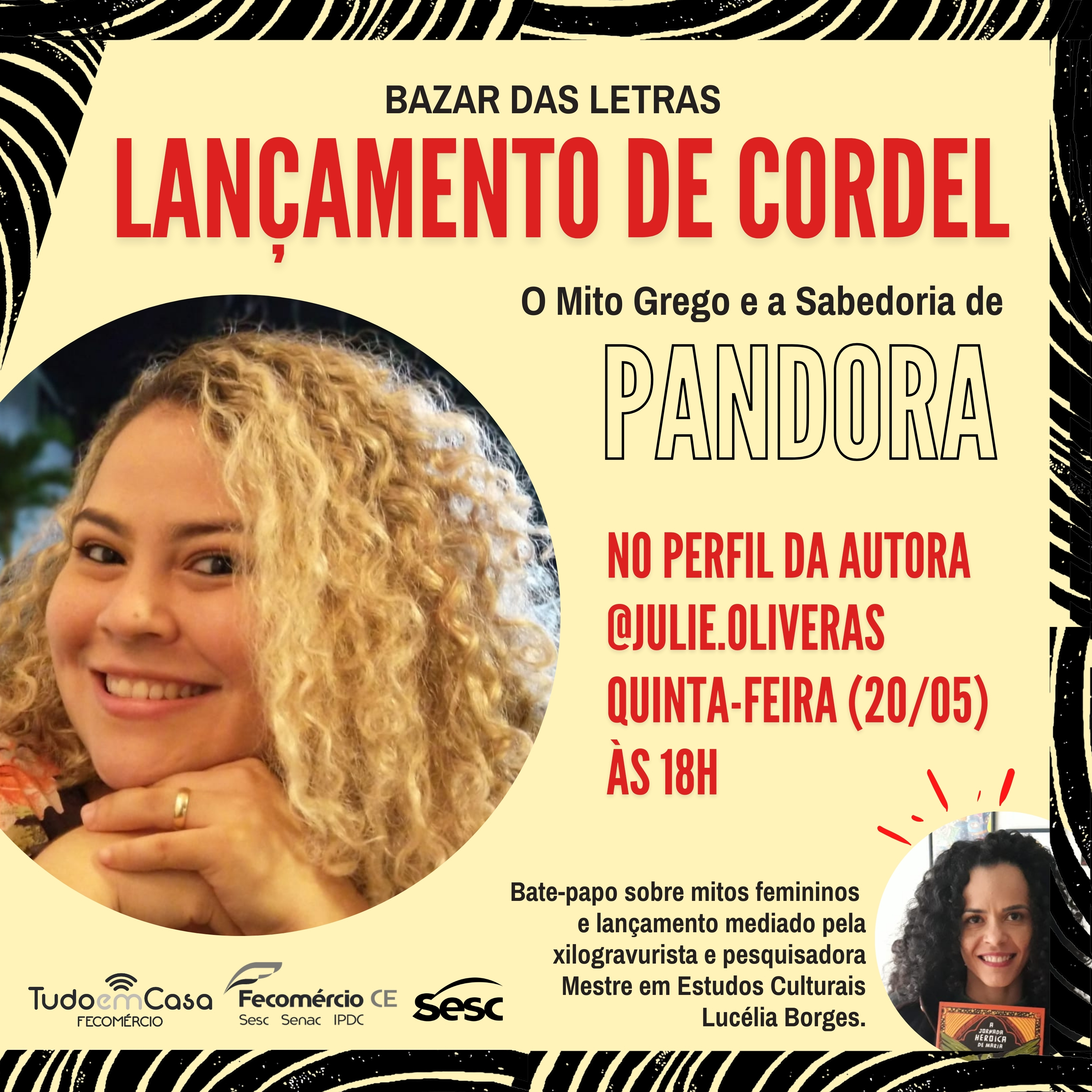 Julie, já ministrou oficinas de cordel e cursos por vários estados do Brasil e em grandes festivais como o MALOCA DRAGÃO, FESTIVAL VIDA & ARTE, e para instituições como o SESC, CAIXA ECONÔMICA FEDERAL e IJCPM (Grupo RioMar Shoppings).