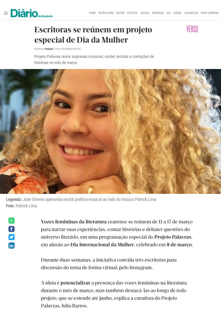 Cordelista, editora, palestrante, pedagoga e produtora cultural, Julie Oliveira atualmente, reside em Fortaleza (CE). Possui 15 livros editados e distribuídos nacionalmente em programas de educação.Desde muito cedo “brinca com as palavras”, como a mesma costuma dizer. Nessa brincadeira, aos 11 anos publicou seu primeiro cordel e aos 15 já estava tendo seus livros publicados por uma grande editora.