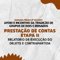 Esta oportunidade foi criada para a Prestação de Contas (Fase 02 - Relatório de Execução do Objeto e da Contrapartida) da CHAMADA PÚBLICA PARA APOIO E INCENTIVO DA TRADIÇÃO DE GRUPOS DE BOIS E REISADOS DE SOBRAL, cujo objetivo é apoiar grupos que irão se apresentar durante as atividades do ciclo festivo de Bois e Reisados no ano de 2022, em conformidade com o artigo 2º da Lei Municipal n°1.244/2013.