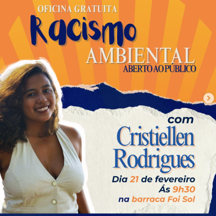 O texto principal anuncia oficina gratuita sobre racismo ambiental, aberta ao público, em parceria com o Instituto Soulest. A atividade será conduzida por Cristiellen Rodrigues.